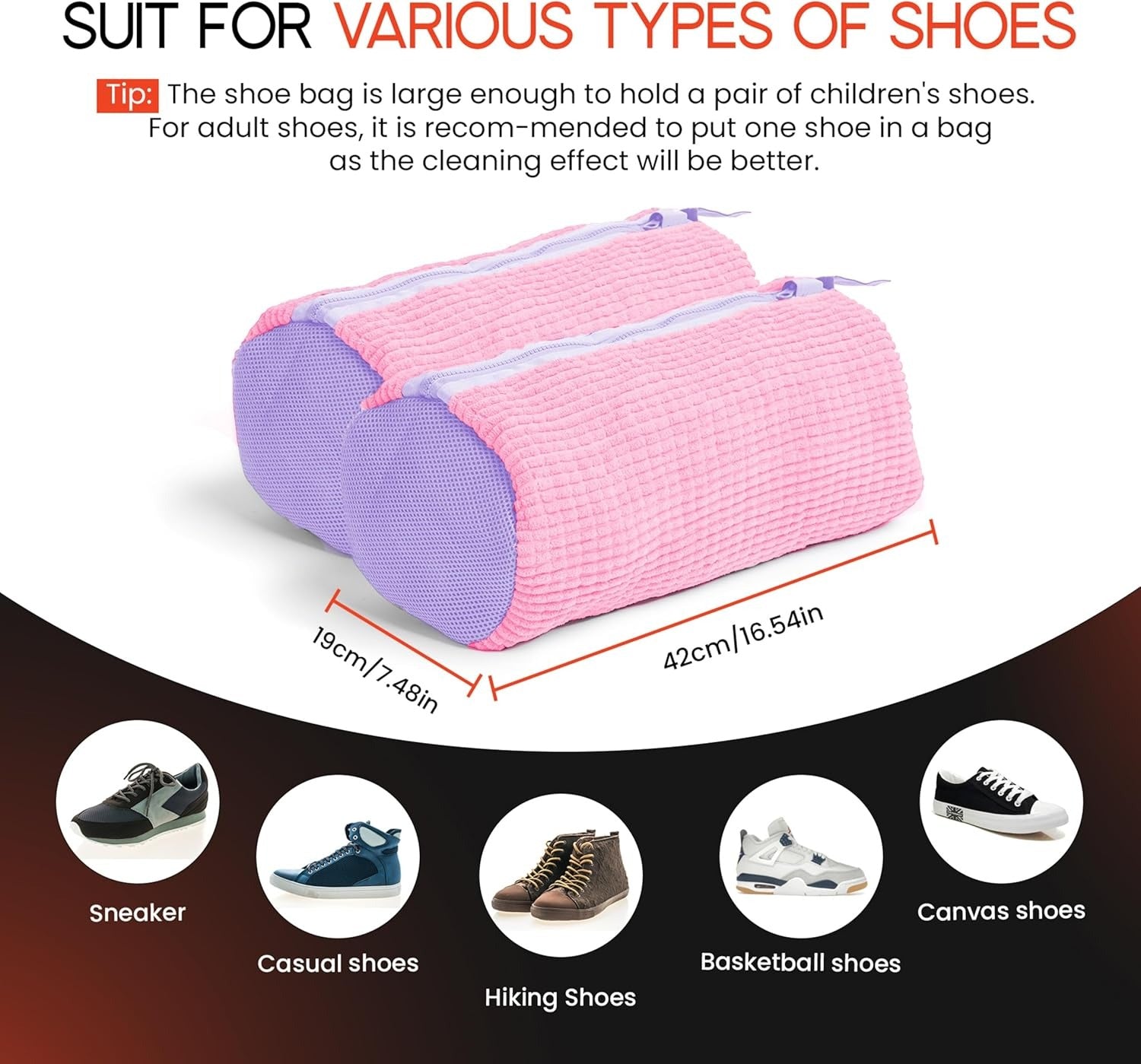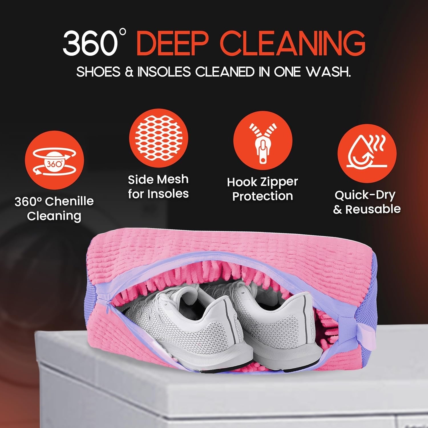 The high-quality shoe washing bag features 360° fluffy chenille fibers that gently scrub away dirt while protecting your shoes and washing machine. The included shoe trees help maintain shape, prevent creasing, and improve wash performance.